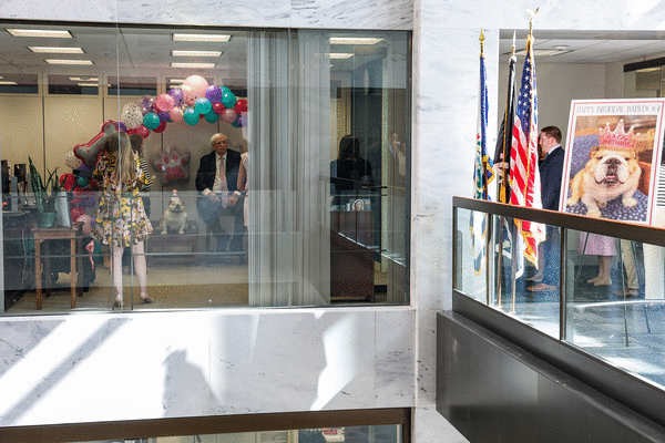 Staff from offices in both chambers and from every political persuasion came to wish Babydog a happy birthday. The Senate pages turned out in full force, snapping photos with the English bulldog, and the senator posed under a colorful balloon arch.
