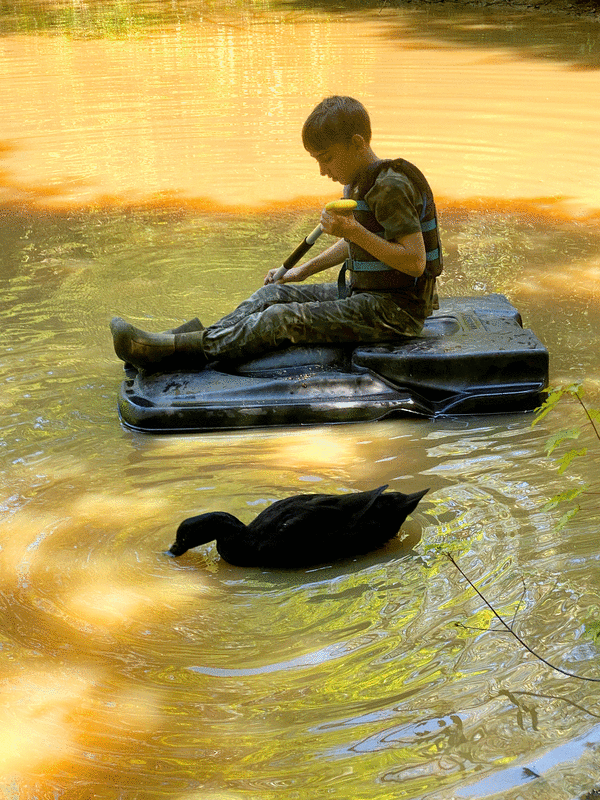 The boy shoves a kayak into the pond, climbs in and lifts Mr. Drake onto his lap. The two silently glide, sending waves gently rippling through the water. The green sheen on the duck’s neck shimmers in the dappled sunlight. The quiet is periodically pierced by a deep, throaty quack.