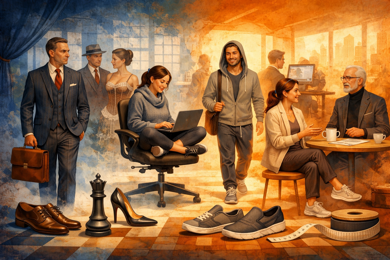 The mid-to-late 20th century introduced cracks in that structure. Youth culture in the 1960s and 1970s challenged dress codes with denim, sandals and loose silhouettes. The 1990s brought “Casual Friday” policies that symbolically loosened corporate rigidity. Still, the underlying expectation remained: comfort was conditional and temporary.